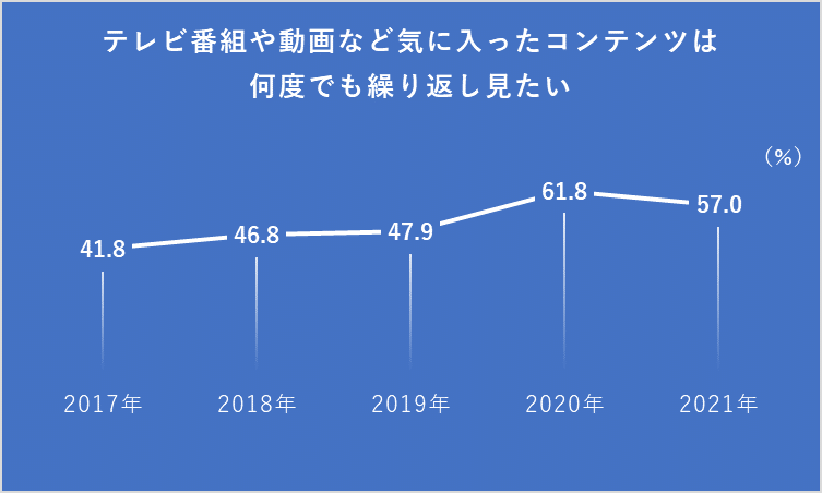 これも、メディアコンテンツに対する生活者の意識である。コロナ禍前から高まっていた「テレビ番組や動画など気に入ったコンテンツは何度でも繰り返し見たい」は6割(57.0%)近い(図4)。生活者は新しいものを見たいだけではなく、好きなものは何度でも見たいと思っているようだ。