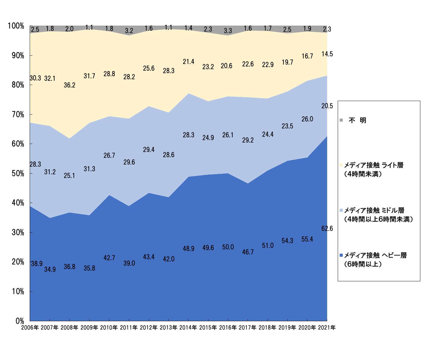 メディア接触者を、長時間接触者であるヘビー層、短時間接触者であるライト層、ヘビー層とライト層の中間に位置するミドル層に分けて時系列で見てみよう。メディア接触全体(テレビ、ラジオ、新聞、雑誌、パソコン、タブレット端末、携帯電話/スマートフォンの7メディア合計)で見ると、ヘビー層(6時間以上接触)の割合が増加していることがわかる。2006年に4割弱(38.9%)だったヘビー層は2021年に6割(62.6%)を超え、15年間で大きく増加した。一方、2006年に3割弱(28.3%)だったミドル層(4時間以上6時間未満接触)は、2021年に2割(20.5%)と減少傾向にあり、ライト層(4時間未満)は2006年の3割(30.3%)から2021年は約1割(14.5%)と半減した。メディア接触全体で見ると、ヘビー層が増加し、過半数を占めるまでになった。(図1)