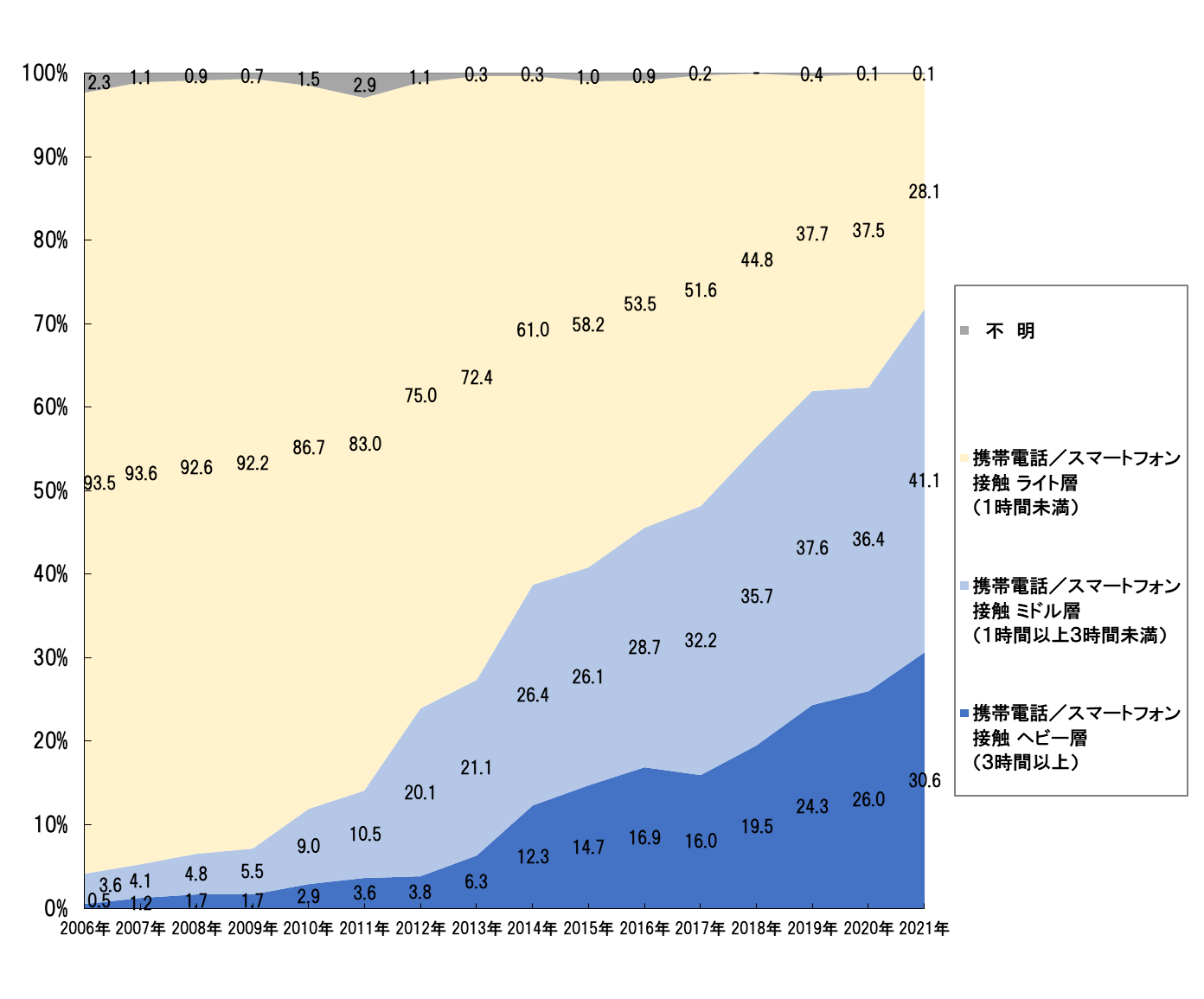 メディア接触全体のヘビー層を牽引しているのは、携帯電話/スマートフォンである。携帯電話/スマートフォン接触者をヘビー層・ミドル層・ライト層※の分布で見ると、2006年に僅か0.5%だったヘビー層は大きく増加し、2021年に3割(30.6%)を超えた。ミドル層も2006年(3.6%)から37.5ポイント増加して4割(41.1%)となった。2006年に9割(93.5%)だったライト層は、2021年に3割(28.1%)を切って急速に減少している。(図2)