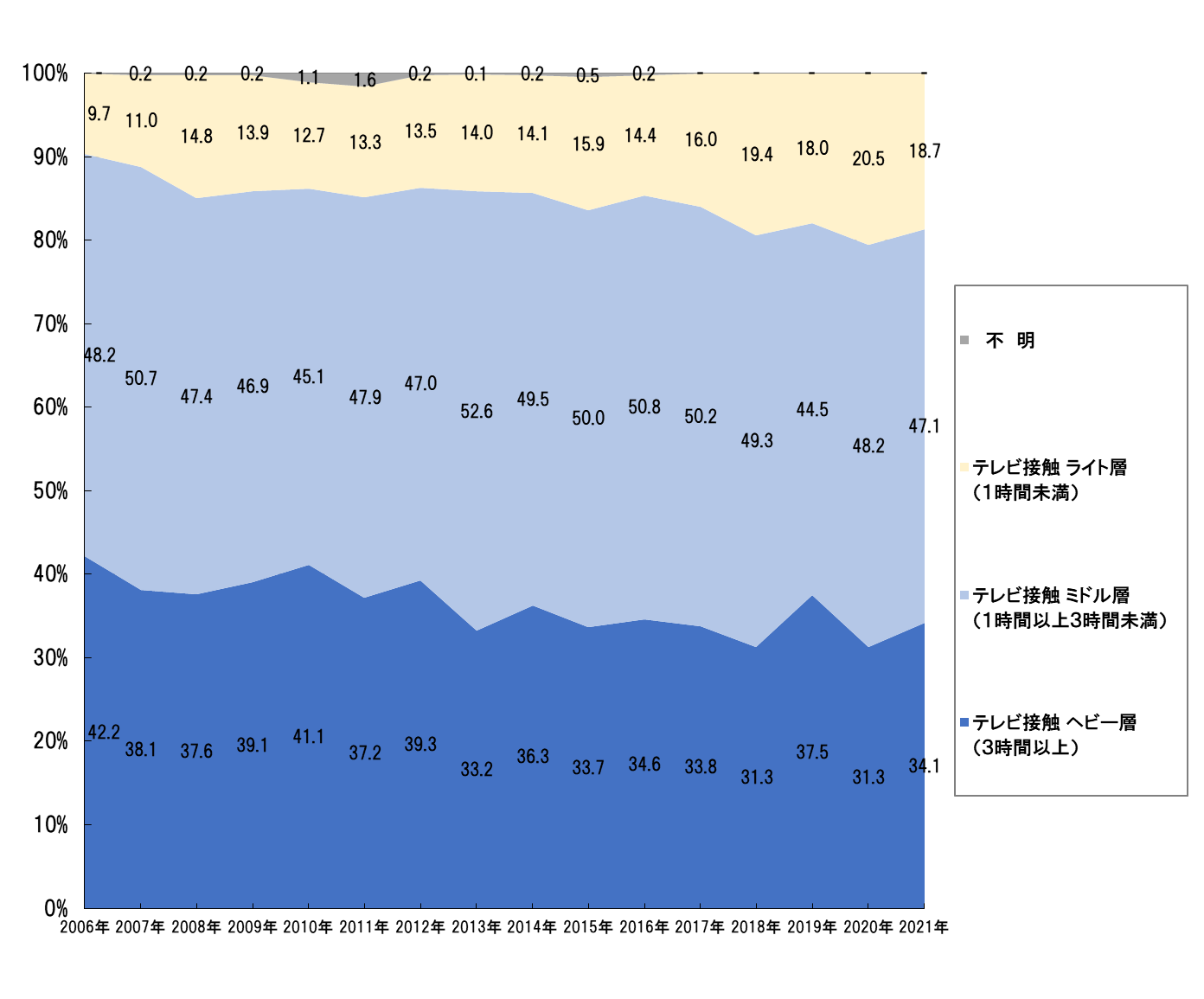 テレビ接触者のヘビー層・ミドル層・ライト層※の分布を見ると、最も大きな割合を占めるミドル層は変化があまり見られず、半数弱で推移している。ヘビー層は2006年の4割(42.2%)から3割(34.1%)と減少傾向、ライト層は2006年(9.7%)から増加して2021年は約2割(18.7%)となった。(図3)