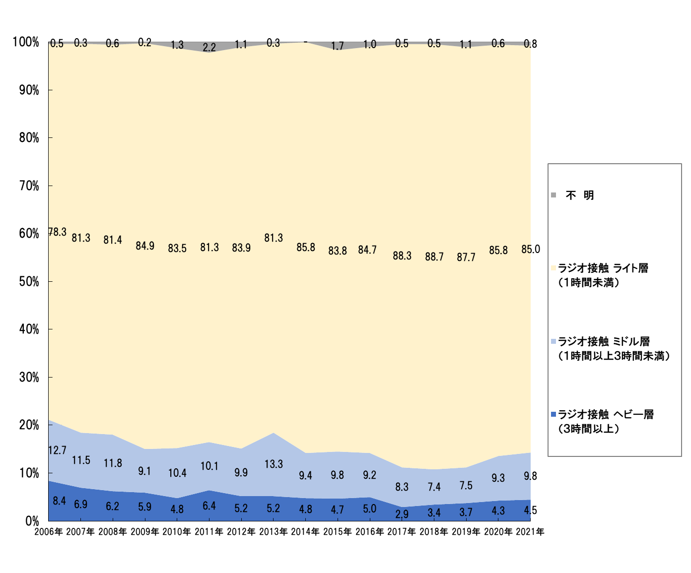 ※ラジオは、テレビ、携帯電話/スマートフォンと同様、ヘビー層:3時間以上接触、ミドル層:1時間以上3時間未満接触、ライト層:1時間未満接触と定義