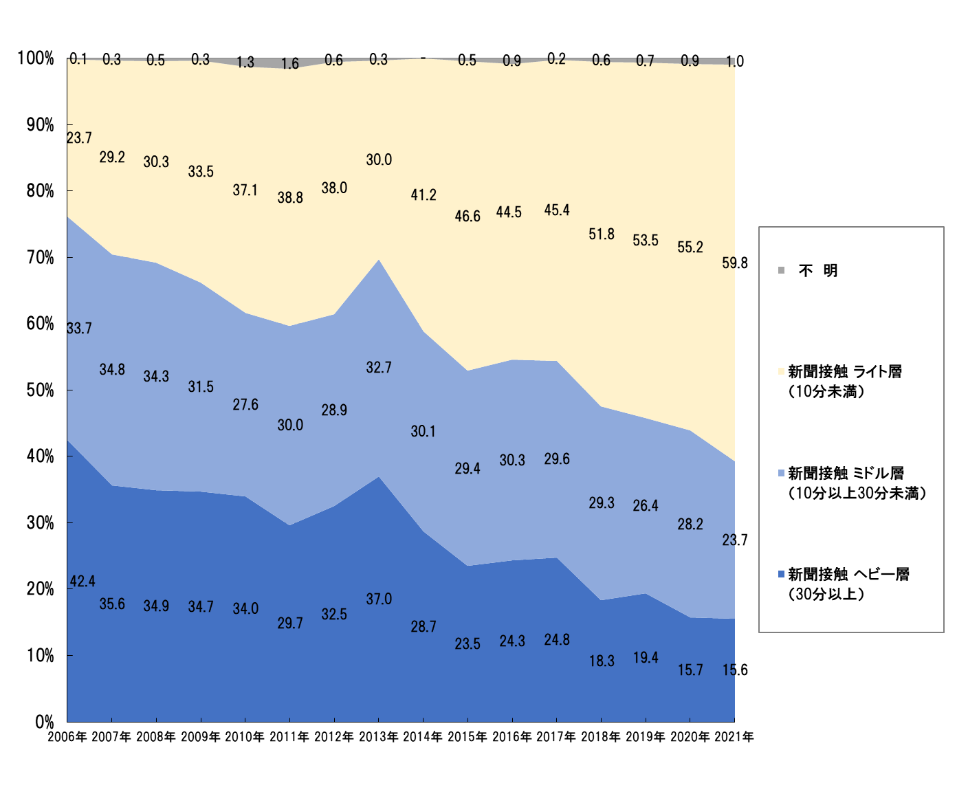 ※新聞と雑誌は、ヘビー層:30分以上接触、ミドル層:10分以上30分未満接触、ライト層:10分未満接触と定義