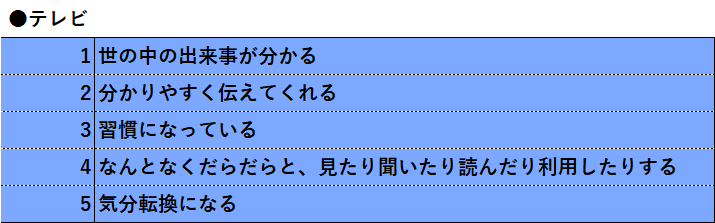 テレビのトップ5は、「世の中の出来事が分かる」「分かりやすく伝えてくれる」「習慣になっている」「なんとなくだらだらと見る」「気分転換になる」である。世の中のことを分かりやすく伝えてくれて、なんとなく見てしまうテレビは、生活者の習慣として組み込まれている。例えて言うなら、いるのが当たり前の家族のような存在である。