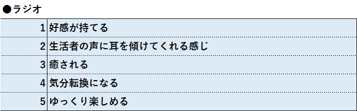 ラジオのトップ5は、「好感が持てる」「生活者の声に耳を傾けてくれる」「癒される」「気分転換になる」「ゆっくり楽しめる」である。好意を持ったり、癒されたりと生活者は情緒的な価値を感じている。心許せる友達に近いかもしれない。