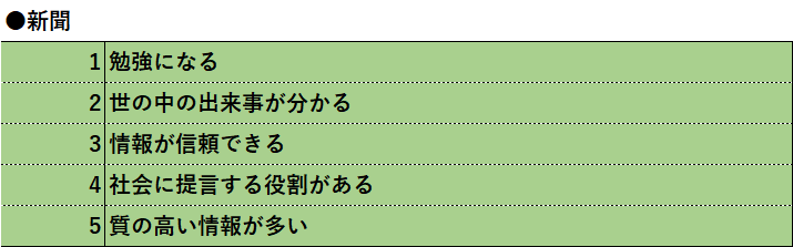 「勉強になる」「世の中の出来事が分かる」「情報が信頼できる」「社会に提言する役割がある」「質の高い情報が多い」は新聞のトップ5である。世の中のことが分かるという点ではテレビと同じ価値を生活者は抱いているが、「勉強」「社会に提言」といった知識・教養の源であり、信頼や質の高さなど一目置かれる先生のような存在として受け止められているようだ。