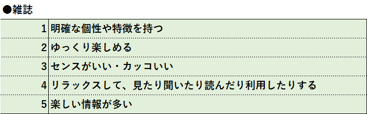 雑誌のトップ5は、「明確な個性や特徴を持つ」「ゆっくり楽しめる」「センスがいい・カッコいい」「リラックスして読む」「楽しい情報が多い」である。際立つ個性が評価されると同時にくつろぎや楽しさを感じさせる情緒的価値もある。目立つ存在の、人気者のクラスメイトといったところか。