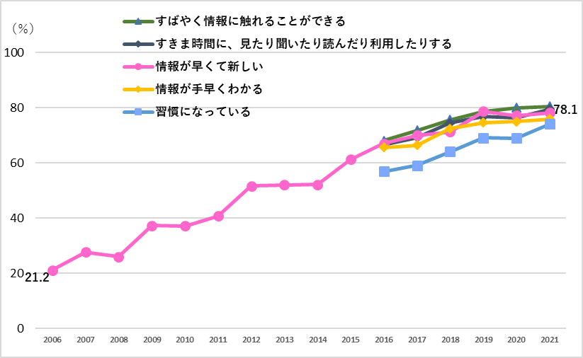 携帯電話/スマートフォンのメディアイメージを時系列で見てみよう。トップ5である「すばやく情報に触れることができる」「すきま時間に見る」「情報が早くて新しい」「情報が手早くわかる」「習慣になっている」はいずれも急速に増加している。2006年から聴取している「情報が早くて新しい」は、21.2%から78.1%まで増加。コミュニケーションツールである携帯電話/スマートフォンが情報メディアに変化した過程が浮かび上がってくる。