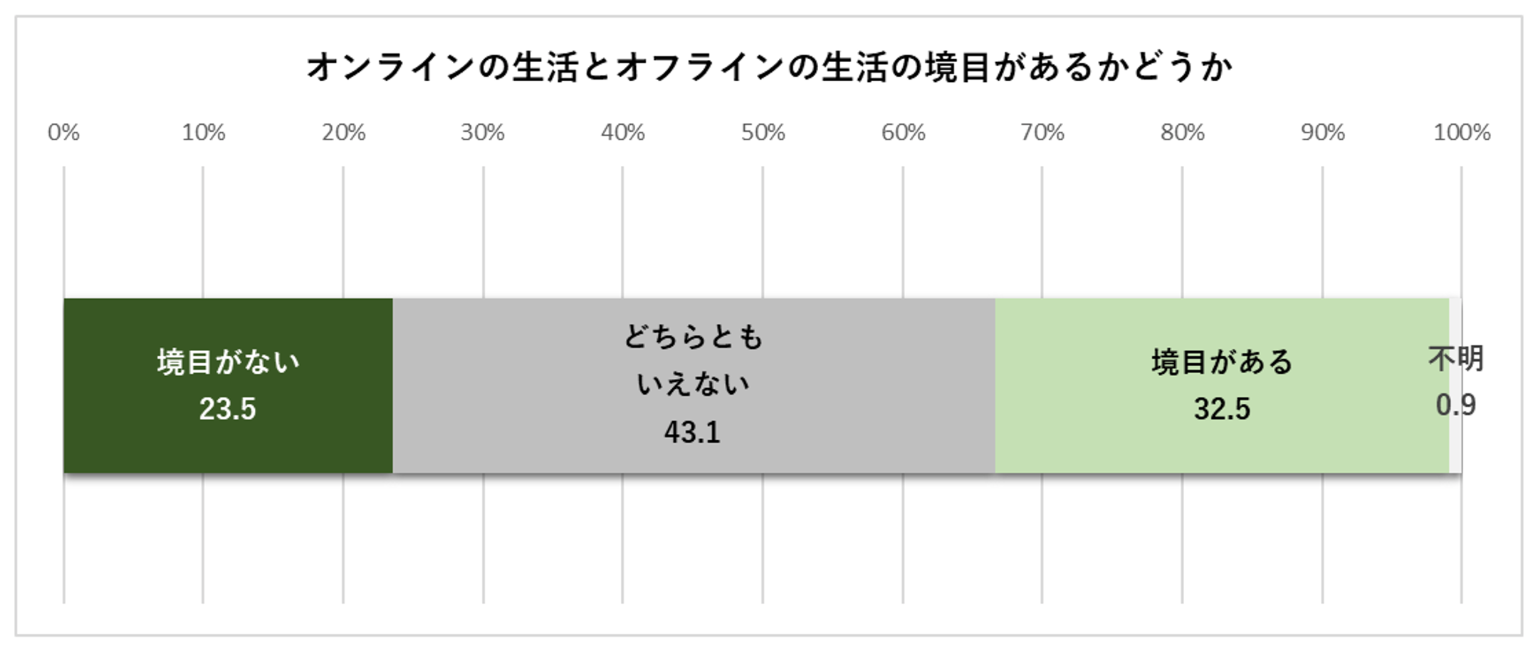 メディア定点調査では、「オンラインの生活とオフラインの生活の境目があるかないか」について聴取している。「オンラインとオフラインの生活に境目がない」は2割強、「オンラインとオフラインの生活に境目がある」は3割強、最も多いのは「どちらともいえない」の4割強であった。境目があるということをどうとらえていいのかわからなくて「どちらともいえない」が多くなったのではないかと推測しているが、「境目がない」という人が既に2割以上いることが興味深い。(図3)