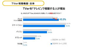 今回の調査でも、TVerを視聴する機器に「テレビ」と答えた人の割合は43.3%となり、2023年の36.8%から伸びていることがわかります。