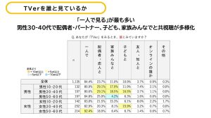 次にTVerを誰と見ているか聞いたところ、「一人で」が約8割。男性30~40代は、「配偶者・恋人と」「家族みんなと」「子どもと」の数値が他の世代に比べて高くなっています。