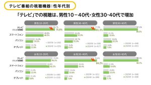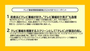 今回の調査では、引き続き「若者ほどテレビ番組が好き」であること、さらに男性10~20代男性に「テレビ好き」が増えていることが見えてきました。