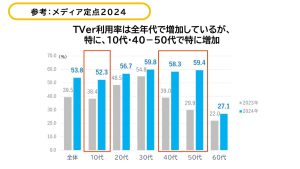 メディア環境研究所が実施した「メディア定点調査2024」によると、TVerの利用率は全年代で増加しており、特に「10代」「40~50代」で増加していることがわかります。