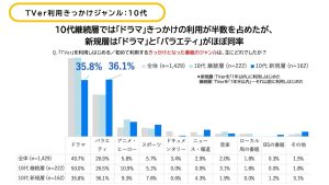 TVerを利用するきっかけとなった番組ジャンルについて、継続層と新規層にそれぞれ聞きました。継続層は「ドラマ」が約半数を占めている一方、新規層は「ドラマ」と「バラエティ」がほぼ同率。40~50代の新規層でも、同様の傾向が見られました。