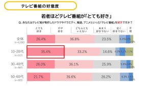 テレビ番組が「とても好き」と答えた人の割合は、全体で26.4%だったのに対し、10~20代では35.4%と各世代でトップ。