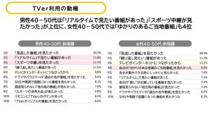 40~50代で見ると、男性は「スポーツ中継」が3位に、女性は「ゆかりのあるご当地番組」が4位に入っています。スポーツ中継やローカル番組がTVerの間口を広げているようです。