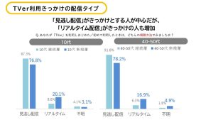 TVerは見逃し配信だけでなく、「リアルタイム配信」にも対応しています。見逃し配信をきっかけにTVerを利用し始めた人が多数を占めていますが、新規層では「リアルタイム配信がきっかけ」という回答も2割ほどみられます。