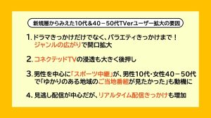 その背景には、コネクテッドTVの浸透や、TVerのコンテンツ拡充などがあり、「リアルタイムや配信の区別なく、好きなときに好きな番組を見られる」という環境が視聴を後押しする様子がうかがえました。
