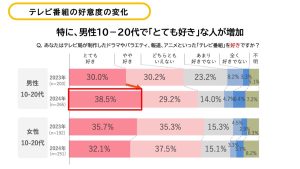 男性10~20代のうち、テレビ番組が「とても好き」と答えた人の割合は、30.0%→38.5%へ大幅アップ。2023年までは“女性の方がテレビ好き”という結果だったのですが、2024年は男性10~20代に「テレビっ子」が増えていることがわかりました。