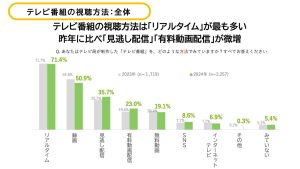 2023年の結果と比べると、「リアルタイム」の割合にほとんど変化はありません。その他は「録画」が微減し、「見逃し配信」「有料動画配信」が微増しています。