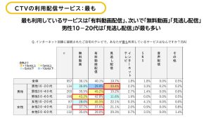 リアルタイム視聴以外で「最も利用しているサービス」を年代別に聞いてみました。多くの世代で「無料動画」や「有料動画配信」がトップとなりました。その一方、男性10~20代では「見逃し配信」が突出しているという結果になりました。