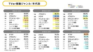 年代別に視聴ジャンルを見てみると、男性10~20代ではスポーツ、男性30~40代ではアニメ・ヒーローが強いとわかります。女性はドラマの割合が高く、特に女性50~60代ではドラマが約8割にのぼりました。