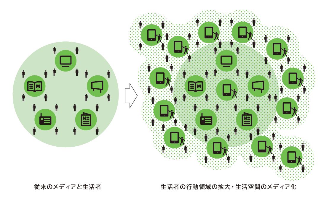 メディアと生活者は、単に情報の送り手と受け手というシンプルな関係から複雑化している。家や車などあらゆるものがインターネットでつながることで、生活空間そのものがメディア化し、コミュニケーションのあり方が変化していく。(「広告ビジネスに関わる人のためのメディアガイド2015」より)