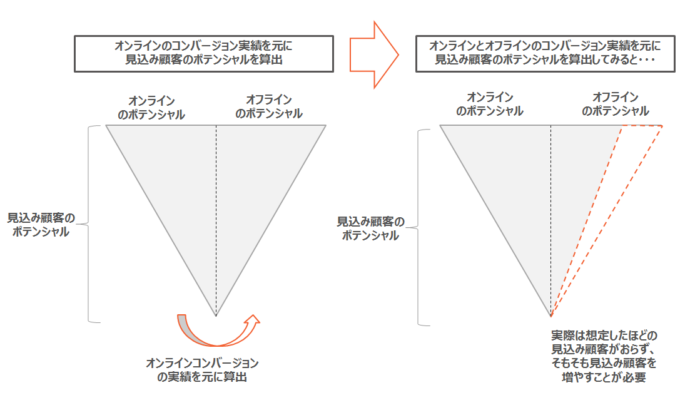 例えば、オンラインのコンバージョン実績から見込み顧客のポテンシャルを算出し、獲得目標を立てて獲得施策中心に広告配信をしていたとします。しかし、オンラインとオフラインのコンバージョン実績をもとに見込み顧客のポテンシャルを算出すると、想定していたほどの見込み顧客はいないと気が付くケースも出てくるはずです。この場合、獲得向けの施策ではなく、潜在顧客を見込み顧客に育成するための施策の方が重要であり、インターネット広告は潜在層向けのリーチを目的とした施策にも注力して活用すべきです。
