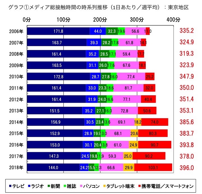 デジタルメディアの接触時間の増加により、メディア総接触時間は過去最高の396.0分