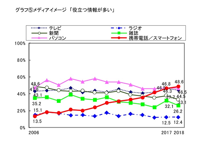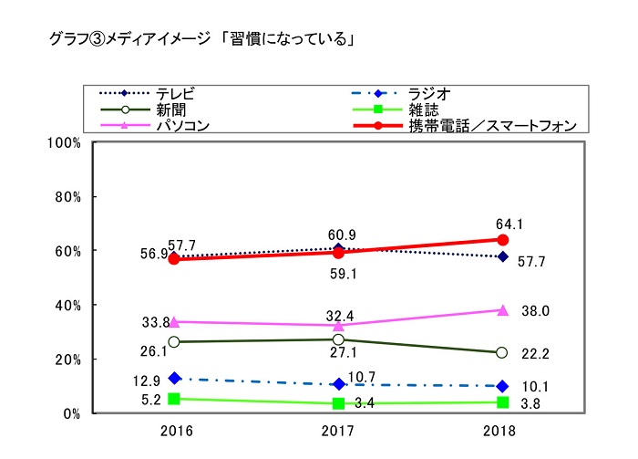 メディアイメージでは「携帯/スマホ」の躍進が目立ちました。「習慣になっている」が5ポイント増(2017年:59.1%→2018年:64.1%)、「仲間との話題に必要」が6.2ポイント増(2017年:45.0%→2018年:51.2%)と「テレビ」を抜き、「役立つ情報が多い」は2.3ポイント増加(2017年:46.3%→2018年:48.6%)して「パソコン」」「テレビ」を抜き、首位に立ちました。「携帯/スマホ」はメディアイメージ42項目中17項目で首位となり、全メディアで最多となりました。