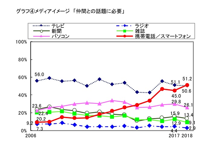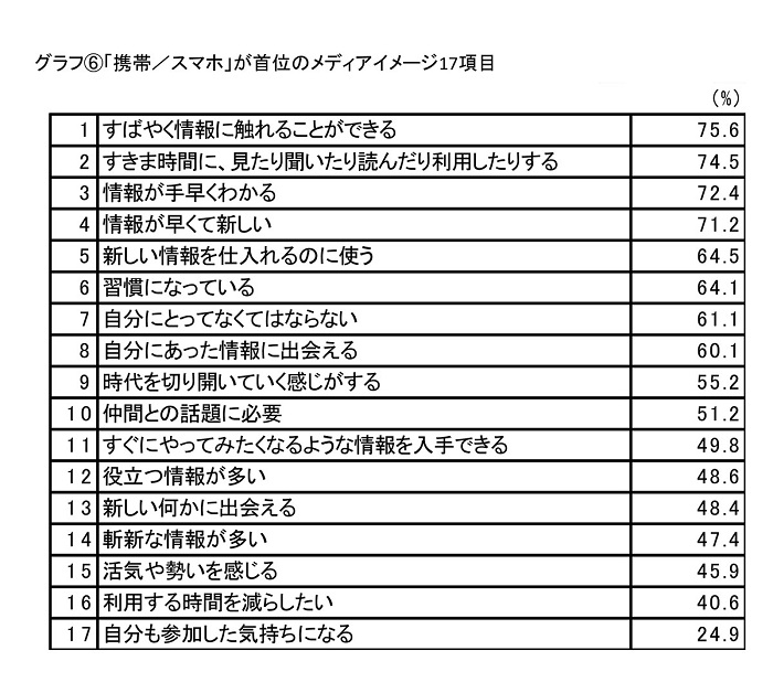 「仲間との話題に必要」「習慣」「役立つ」のメディアイメージ、「携帯/スマホ」」が首位に
