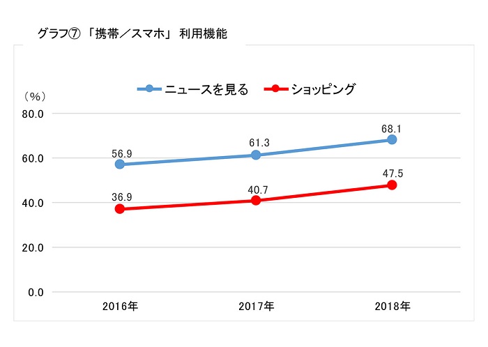 「携帯/スマホ」の利用機能も拡大しています。検索は今年「携帯/スマホ」(83.9%)が「パソコン」(79.0%)を抜き、動画視聴も「携帯/スマホ」(無料:54.0%、有料:11.2%、)が「パソコン」(無料:52.9%、有料:10.1%)を上回りました。今年、「携帯/スマホ」の利用機能で大きく伸びたのは、ニュースを見る(2017年:61.3%→2018年:68.1%)とショッピング(2017年:40.7%→2018年:47.5%)で、それぞれ7ポイント近く伸長しました。「携帯/スマホ」