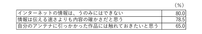 そのため、情報量に埋没されない届け方をしなければならないし、生活者が求めるスピードにも応えていかなくてはなりません。と言って、ただ速く届ければよいわけではありません。「メディアに関する意識・行動」79項目の中で今年のトップ3は、「インターネットの情報は、うのみにはできない」「情報は伝える速さよりも内容の確かさだと思う」「自分のアンテナに引っかかった作品には触れておきたいと思う」でした〈図表⑤〉。