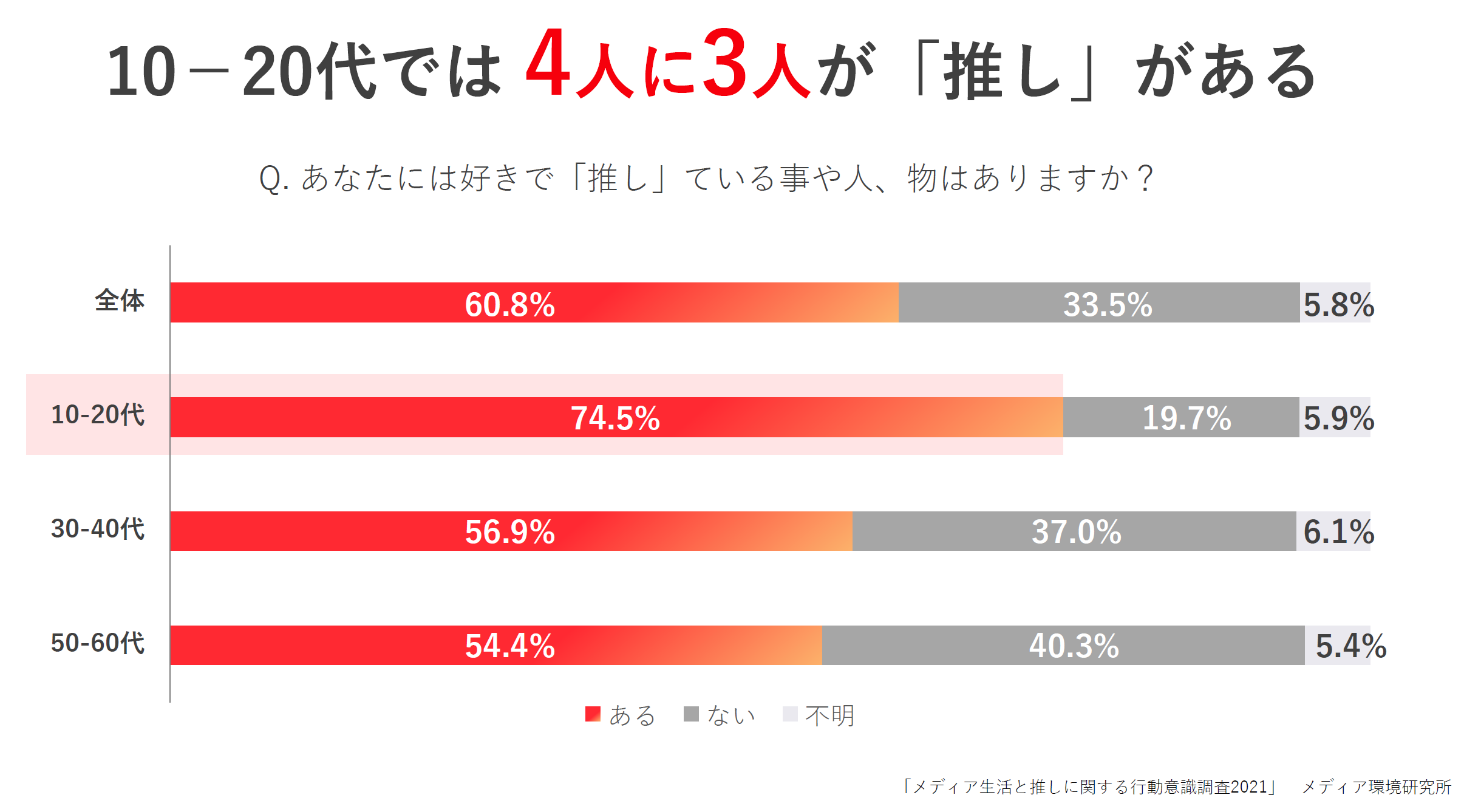 では早速、メディア生活と推しに関する調査結果をご報告します。「好きで推している事や人、物はありますか」の問いに「ある」と答えた方は60.8%。年代別で見ると10代、20代は4人に1人が推しを持っています。