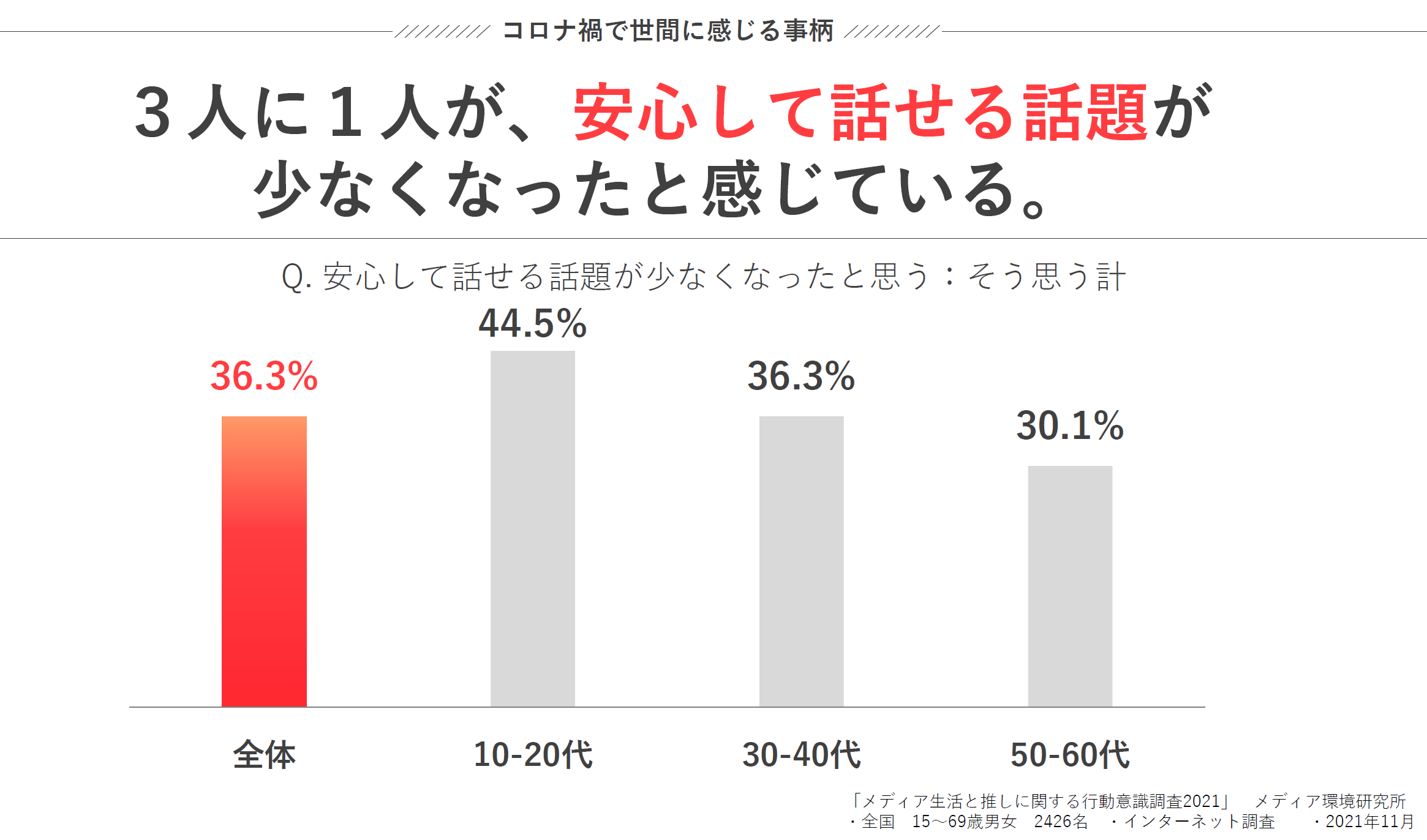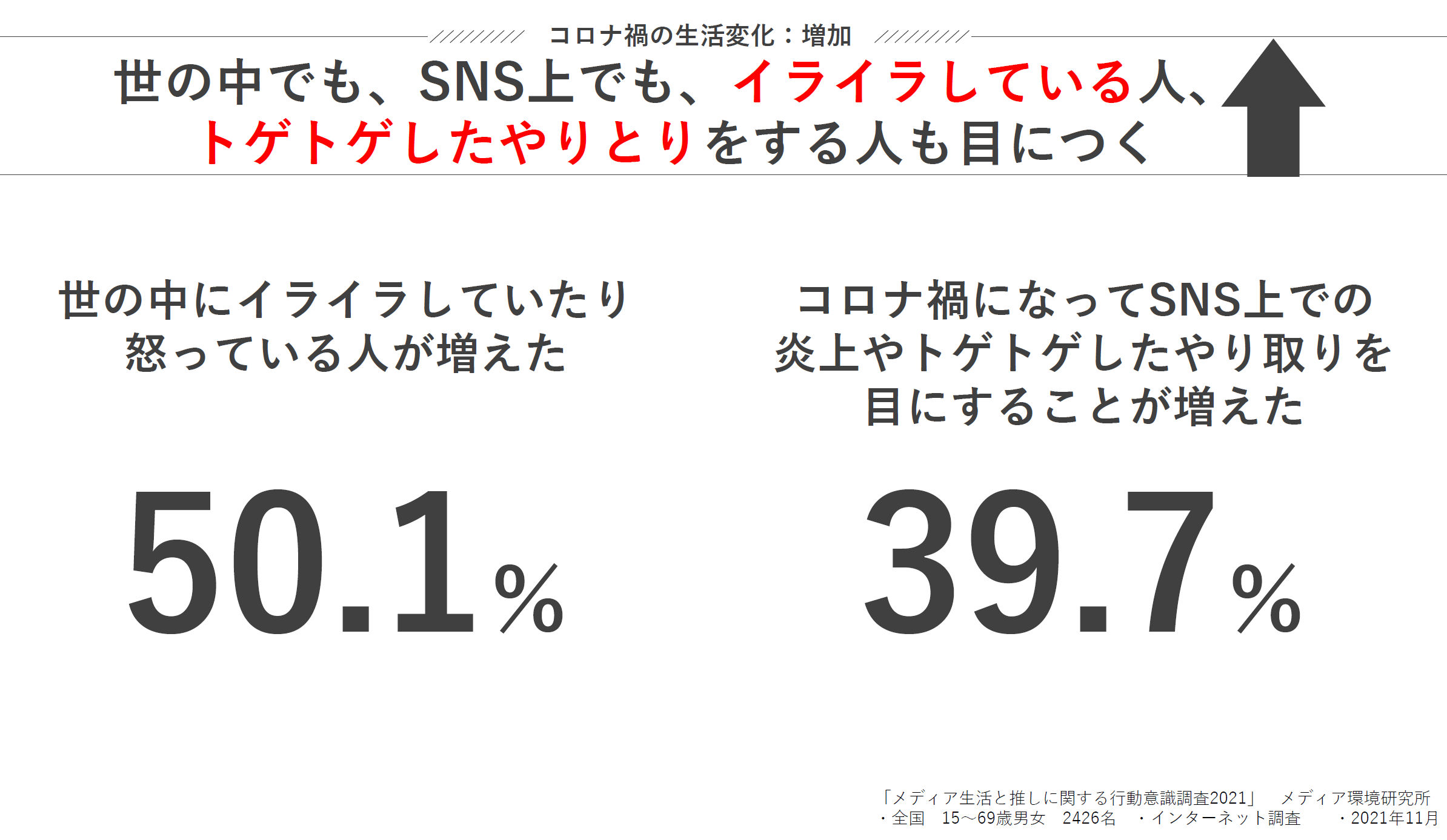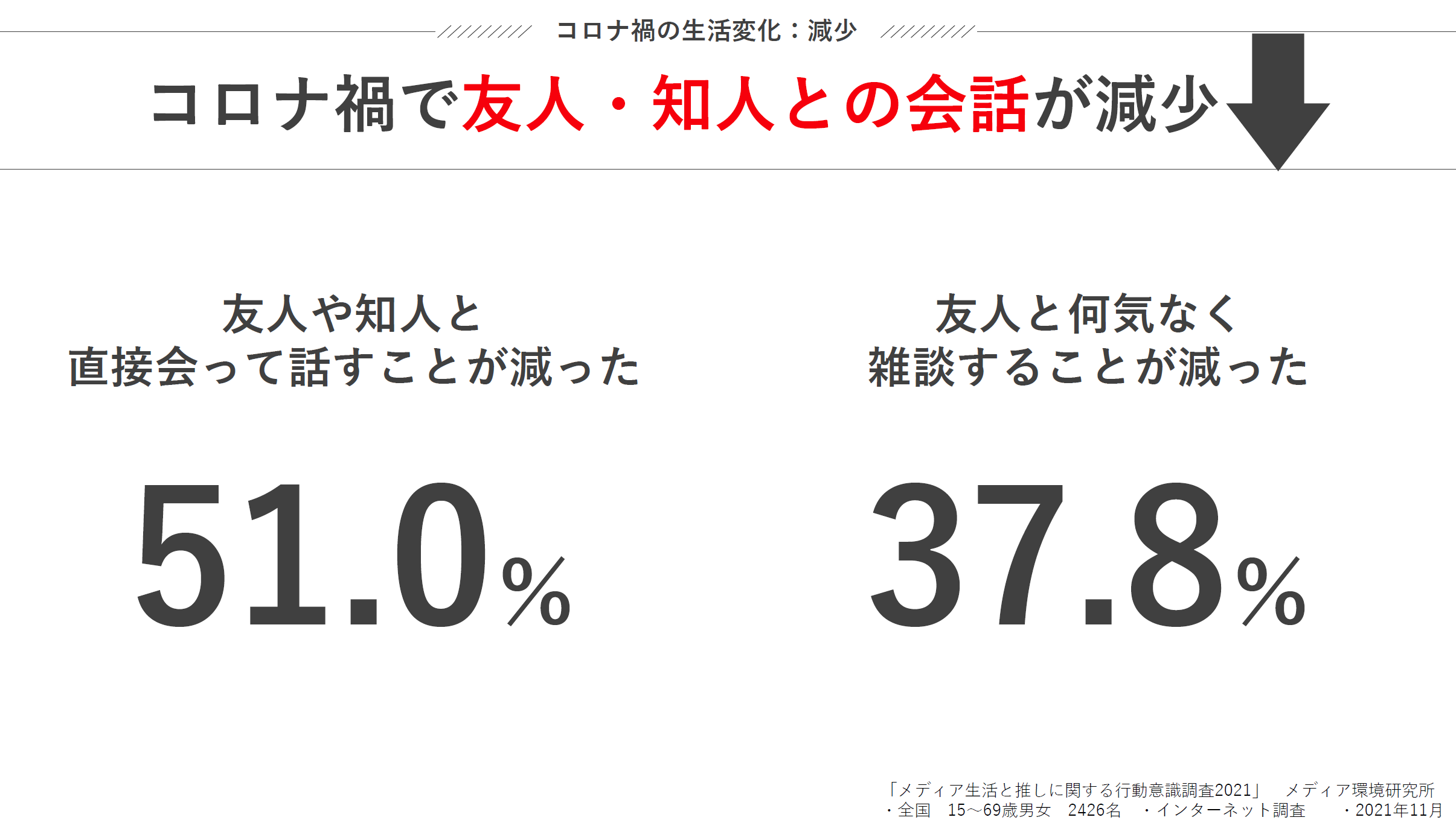 都内に住む大学生のAさんは、授業がオンライン化したのに伴いテレビやSNSに触れる時間が増え、「Nizi Project」や「鬼滅の刃」「僕のヒーローアカデミア」にはまったそうです。友人との付き合いもオンライン化したため、Twitter上で友人と推しを発信し合っています。オンラインでは話しかけるきっかけが難しいこともあると思いますが、Aさんにとっては推しがその糸口となっている。推しの話題であれば突然話しかけても喜ばれるし、うまくやりとりができるようです。ではなぜ、さまざまあるコミュニケーションツールのなかで推しを活用しているのでしょうか。コロナ禍により「友人や知人と直接会って話すことが減った」「友人と何気なく雑談することが減った」の項目がそれぞれ51%、37.8%。逆に「世の中にイライラしていたり、怒っている人が増えた」が50.1%、「SNS上での炎上やトゲトゲしたやりとりを目にすることが増えた」は39.7%と、4割近くの人が感じています。さらに10代20代の44.5%が「安心して話せる話題が少なくなった」と感じています。