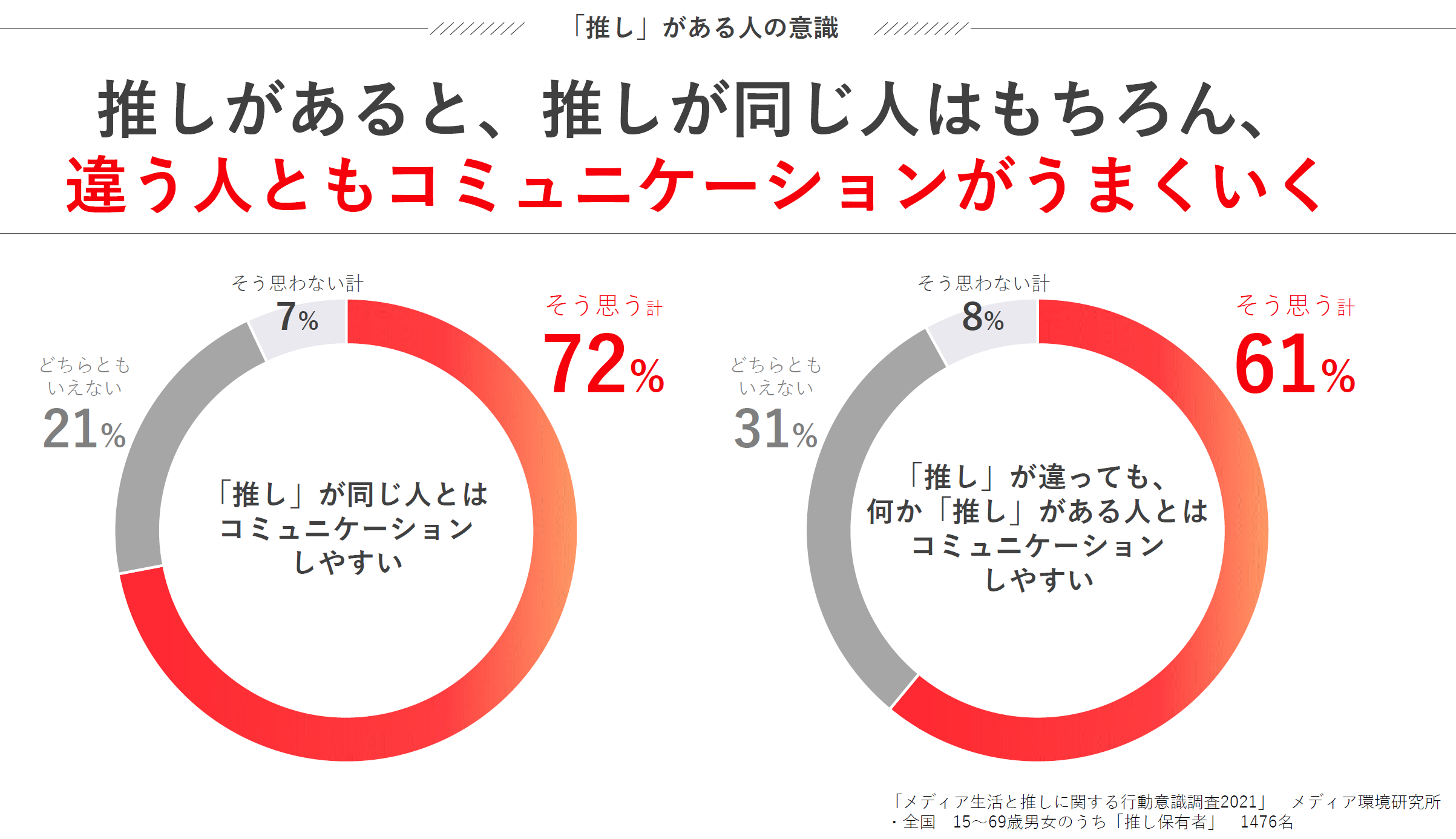 また、韓国アイドルグループ推しのMさんは、推しの対象が違っても、推しがあることで、会社の同僚というよりも友人として付き合えるようになった人がいるそうです。このように推しは新たな仲間との架け橋になっていて、その背後には多くの人とコミュニケーションしたいというモチベーションがあることがわかります。推しがあれば、同じテンションになり、共感して仲間になれる。一人で深く愛でるというこれまでの推しから、より充実したコミュニケーションのために推しを活用するという、新たな役割が生まれています。