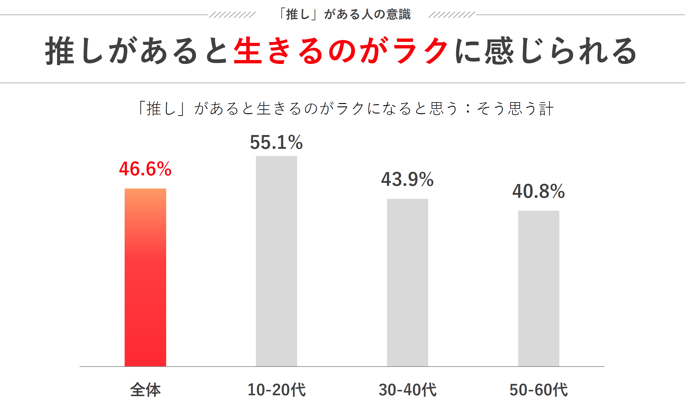 一方で推しを持っていると答えた人の回答を見てみると、「推しが同じ人とはコミュニケーションしやすい」という人が72%、またたとえ「推しが違っても、何か推しがある人とコミュニケーションしやすい」と思う人は61%いました。ひいては「推しがあると生きるのがラクになると思う」と答えた人は全体で46.6%、10代20代では55.1%に上ります。