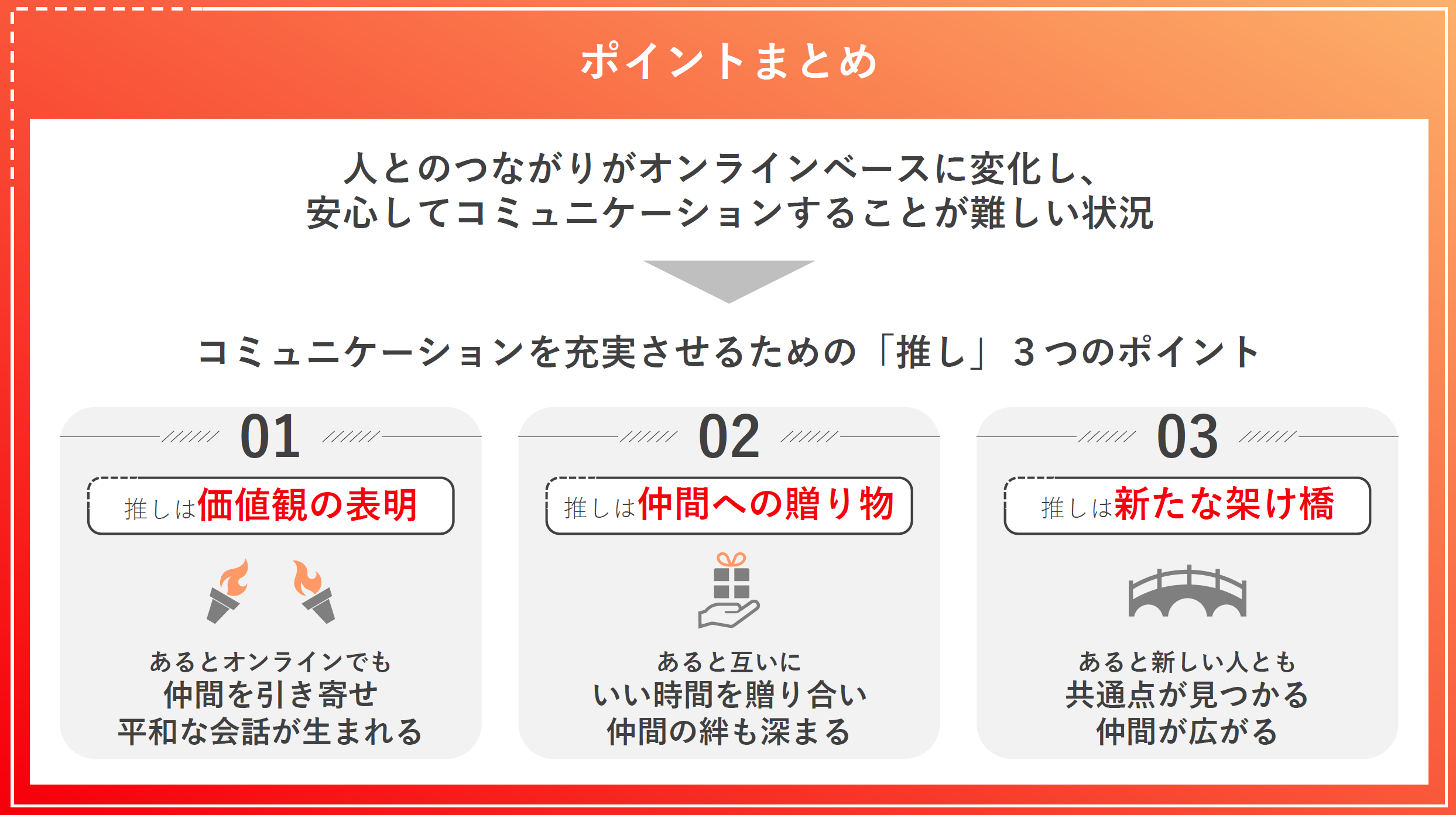 人とのつながりがオンラインベースになり、安心してコミュニケーションすることが非常に難しくなってきた状況で、安心のコミュニケーションのために推しが活用されている。そこでのポイントは、1つ目は「推しが価値観の表明」であること。2つ目は「推しは仲間への贈り物」であること。そして3つ目は「推しは新たな仲間への架け橋」であることです。