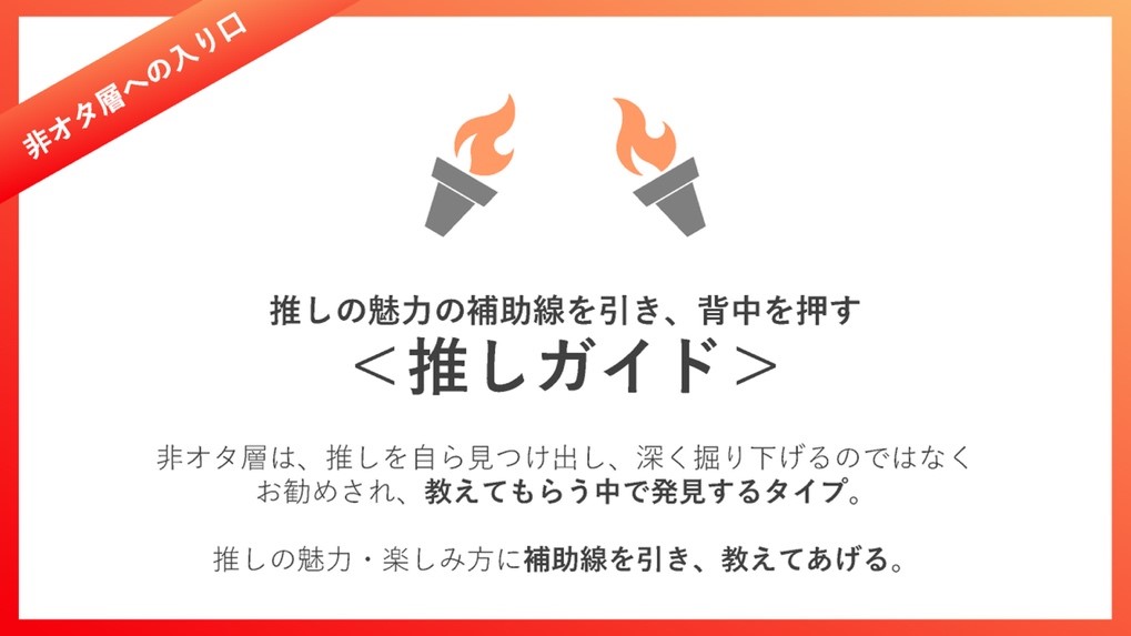 こうした新たなスタイルの推しは、メディア・コンテンツ、広告ビジネスにおいてどのような新しいチャンスをもたらすのでしょうか。ここでポイントなのは、非オタク層が推し市場に参入してきたということです。彼らは推しを愛するだけではなく、推しを通して安心してコミュニケーションし、仲間をつくることを重視します。この欲求をしっかり捉えなければなりません。つまり、「非オタの推し仲間づくり」を、ビジネスサイドが推進、支援することがチャンスになるのではないでしょうか。そのためには、まず非オタの推し仲間への入口をつくることが必要です。推しの魅力の補助線を引き、背中を押してあげるような、「推しガイド」を推進しましょう。非オタ層は推しを自ら見つけ出し、掘り下げるのではなく、人からおすすめされるなかで自らの推しを発見するタイプです。いま彼らは、どの推しをどう楽しめるかということを、自発的に教え合い、推しへの入口を自分たちでつくっています。コンテンツの持つさまざまな側面、属性を、そのカテゴリーが好きそうな人々に向けて発信し、1つのコンテンツから多様な入口をつくっていくべきでしょう。
