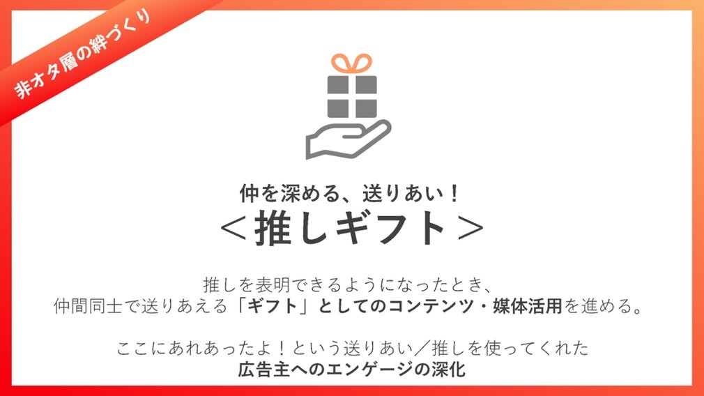 次に重要なのは、推し仲間との関係性を深めるお手伝いをすることです。仲を深める贈り合い、「推しギフト」を推進する。街中や駅で見かけた推しの広告を写真に撮って贈ってあげるというように、推し仲間にとっては広告も仲を深めるためのギフトになり得ます。アウトドアメディアや動画をオンライン活用し、仲間同士で贈り合える、自然拡散する広告媒体活用に可能性がありそうです。それは、推しを使ってくれた広告主へのエンゲージを深めるという効果にもつながるでしょう。
