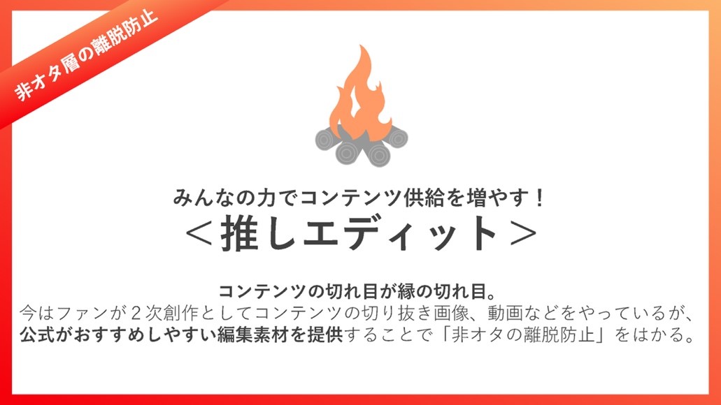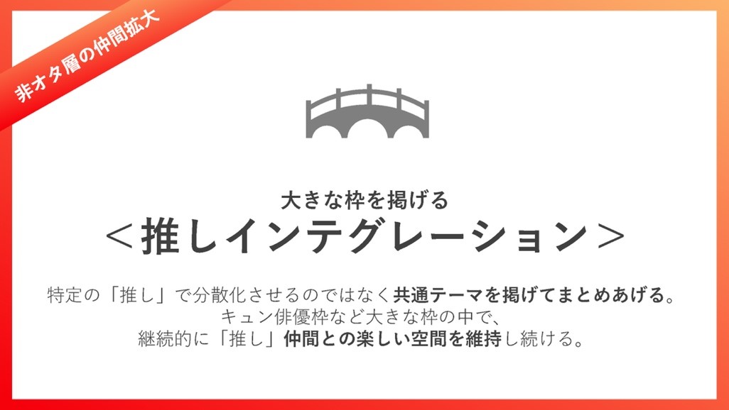 特定の推しにとどまらず、その枠を越えて束ねることで、楽しむ仲間の数を増やすわけですね。こういった、特定の推しだけで分散するのではなく、共通のテーマを掲げてまとめ、より多くの枠を掲げる「推しインテグレーション」を推進するのも一案でしょう。