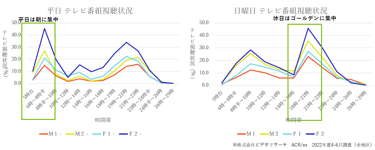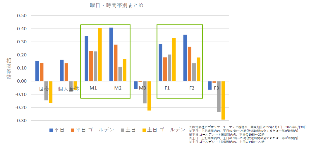 中年層(M2、F2)で相関が高かった平日は、朝の視聴状況が影響しており、若年層(M1、F1)で相関が高かった土日は、特に日曜のゴールデンタイムが影響していることが推測できます。