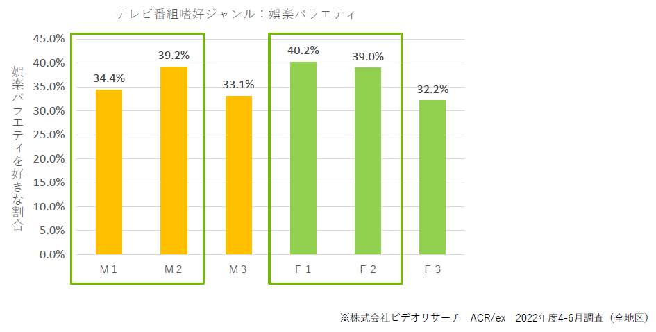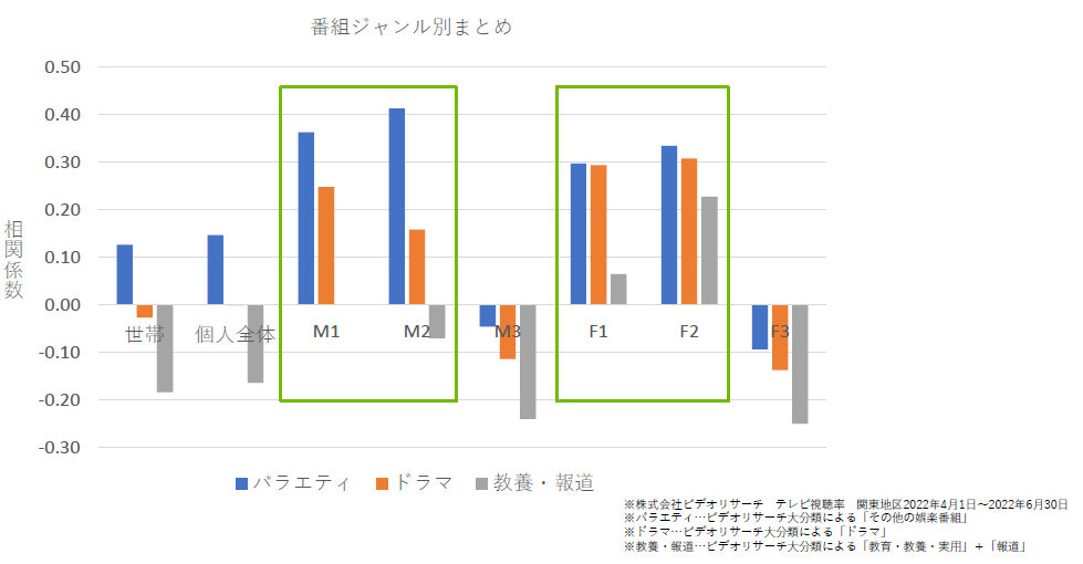 男性(M1、M2)は「バラエティ」の相関係数が高く、特にM2は突出しています。女性(F1、F2)は「バラエティ」「ドラマ」の相関が高く、F2は「教育・教養・実用+報道」も高い傾向が見られます。