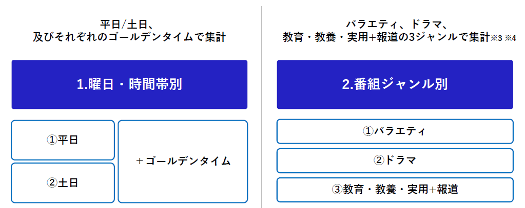 本レポートでは、テレビ番組を「1. 曜日・時間帯別」「2. 番組ジャンル別」で分類し、各テレビ番組の視聴率(世帯/個人/性年代別)※1とTikTokにおける番組関連動画の合計視聴数※2の相関関係を分析しています。