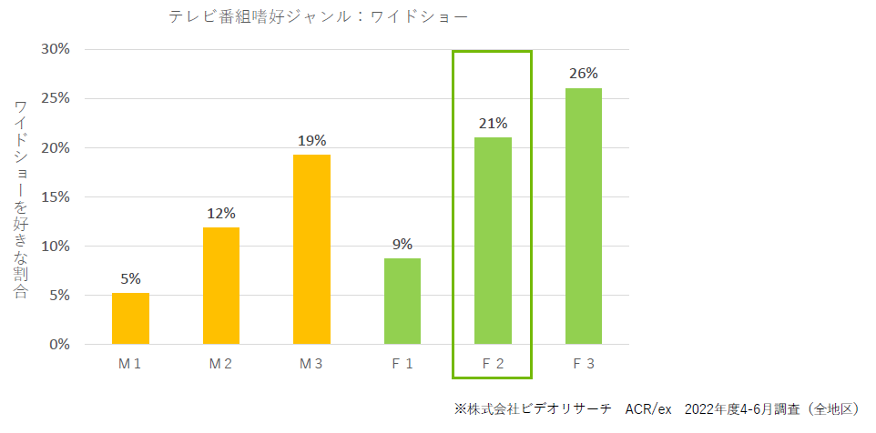 F2、F3は「ワイドショー」を嗜好ジャンルとして選ぶ傾向が高く、それはテレビ番組の視聴が平日の朝に集中していることにも表れています。