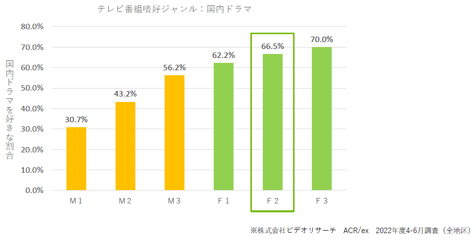 男性よりも女性の方がドラマを好む割合が高く、その中でもF3よりもF2は相関が高くなりやすいと推測できます。