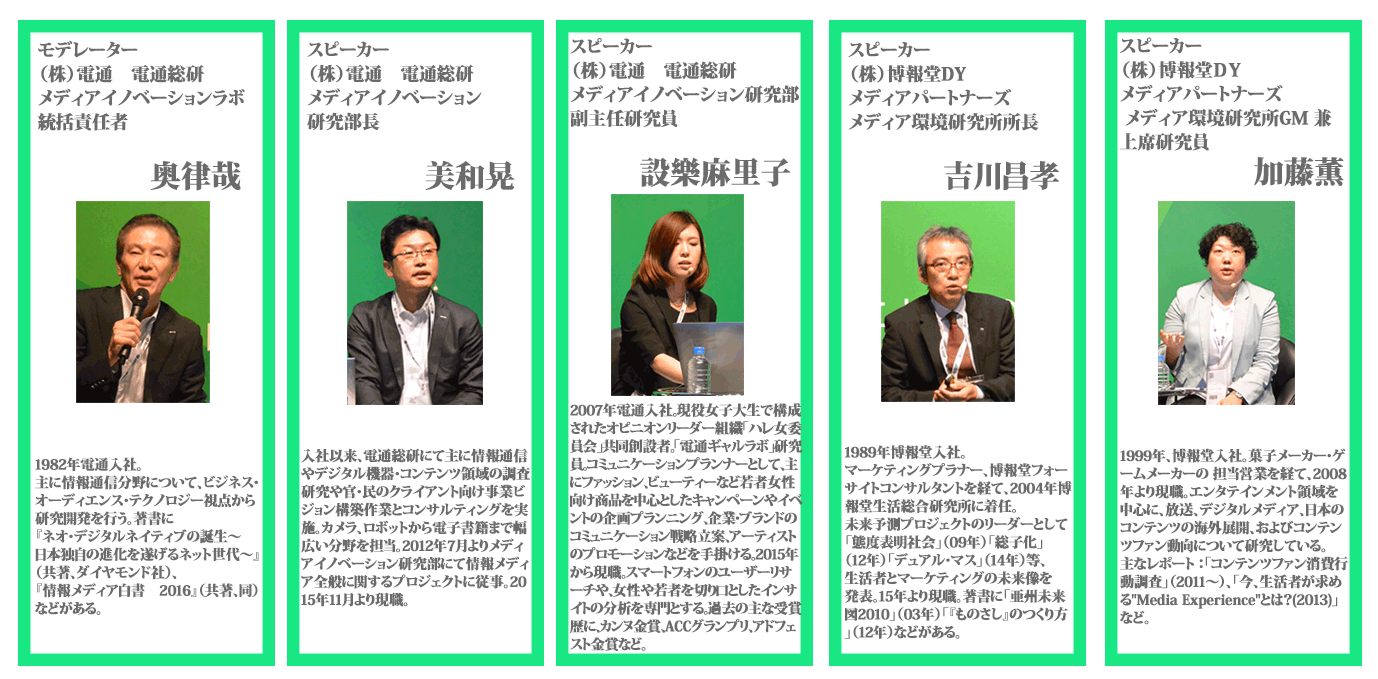 2016年5月30日~6月2日に東京・六本木で、アジア初となるアドバタイジングウィーク・アジアが開催されました。業界の最先端を走るキーパーソンが登壇し、ブランド、メディア、マーケティング、テクノロジーや文化について熱い議論が交わされました。本セッションでは電通総研とメディア環境研究所が、各々の最新メディア行動研究の結果をもとに、独自の切り口で若者のモバイルコミュニケーションの最新トレンドについて紹介しました。(以下敬称略)