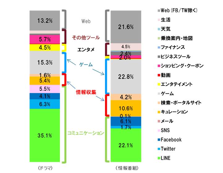 Web・アプリ行動を見てみると、情報番組はドラマより情報発信の行動が少なく「インフォメーション行動」(情報収集)が多くなっています。番組から発信される様々な情報に刺激され行動を起こすために情報収集している様子が見えてきます。一方ドラマでは、LINE、Facebook、Twitter、SNSなどでの「コミュニケーション行動」(情報発信)が目立ちます。