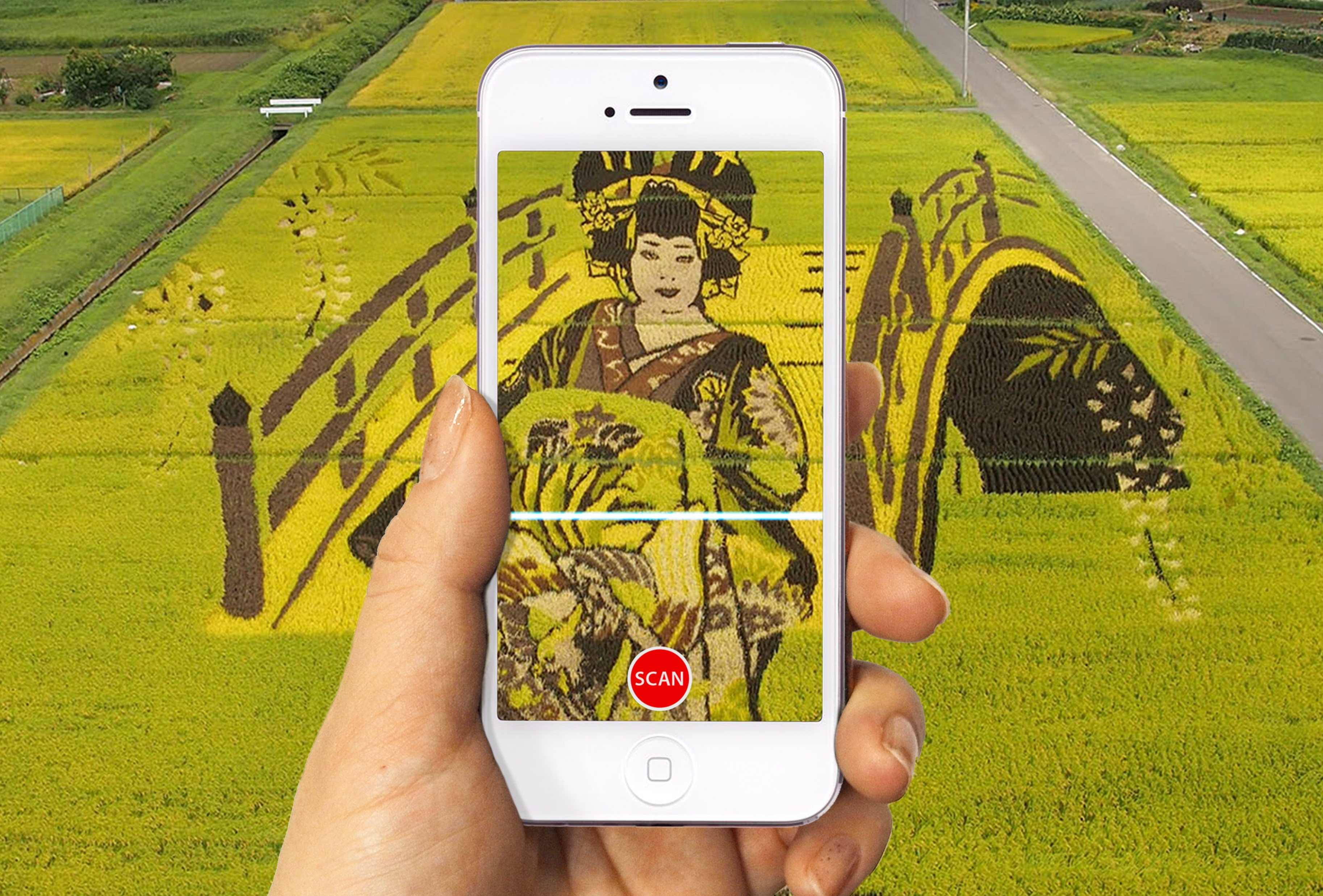 例えば、スダラボの自主開発第1弾「ネイチャー・バーコード」は、「観光地でお土産を買っても、重い荷物を持たずに手ぶらで帰って来たい」「田舎の農道とかで見る無人販売所のような、なごむEコマがあったらいいのに」という自分たちの「素直なわがまま」を見つめてみたものでした。そんなブレストのアイデアがいくつか合体して、「風景をバーコードのように読み込み、その土地の特産品を簡単に買えるようにする」という大きなコンセプトが生まれました。その汎用スマホアプリを、わかりやすく「ネイチャー・バーコード」と名づけました。そして、その実証実験第1号が、青森県田舎館村の「田んぼアート」で画像認証を体験する「ライスコード」でした。