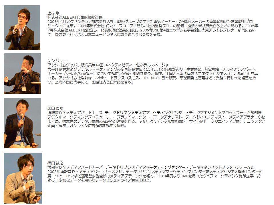 モデレーターは、データドリブンメディアマーケティングセンター・データマネジメントプラットフォーム部長柴田貞規。株式会社ALBERT代表取締役社長の上村 崇さん、アクシオムジャパンのケン リューさん、データドリブンメディアマーケティングセンターデータマネジメントプラットフォーム部篠田裕之がパネリストに名を連ねました。(以下敬称略)