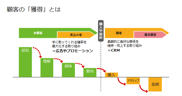 広告やプロモーションは、あるターゲットに対して『認知』をとることから始まり、そこから『理解』『興味』『意向』『購入』へと進めるもので、商品・サービスを手に取ってもらう確率を最大化する取り組みともいえます。それに対してCRMは、商品やサービスを購入した顧客と、長期的に良好な関係を維持したり、関係を向上させたりする取り組みであり、一度購入して下さった顧客から優良顧客になってもらう取り組みになります。「購入」「アクティブ」「長期」と段階を踏む中で、購買単価が上がったり、ブランドを好きになってもらったりといったことも期待できます。